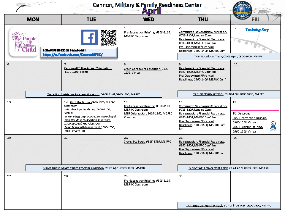 The M&FRC operational concept is to provide targeted law and mission-driven services to Commanders and assist them in developing and executing policies, programs and processes to enhance individual, family and community readiness, resiliency, quality of life and motivation to serve. Our center serves all Wing active duty and civilian, tenant units, TDY and retired personnel assigned to or visiting Cannon AFB, NM. The M&FRC staff members are a critical part of the Cannon Resiliency Team which includes other base helping agencies (Mental Health, Family Advocacy, Medical EFMP, Chapel, FSS agencies, Health and Wellness, EO etc.), Preservation of the Force and Family (POTFF) resources and Military and Family Life Counselors (MFLC).