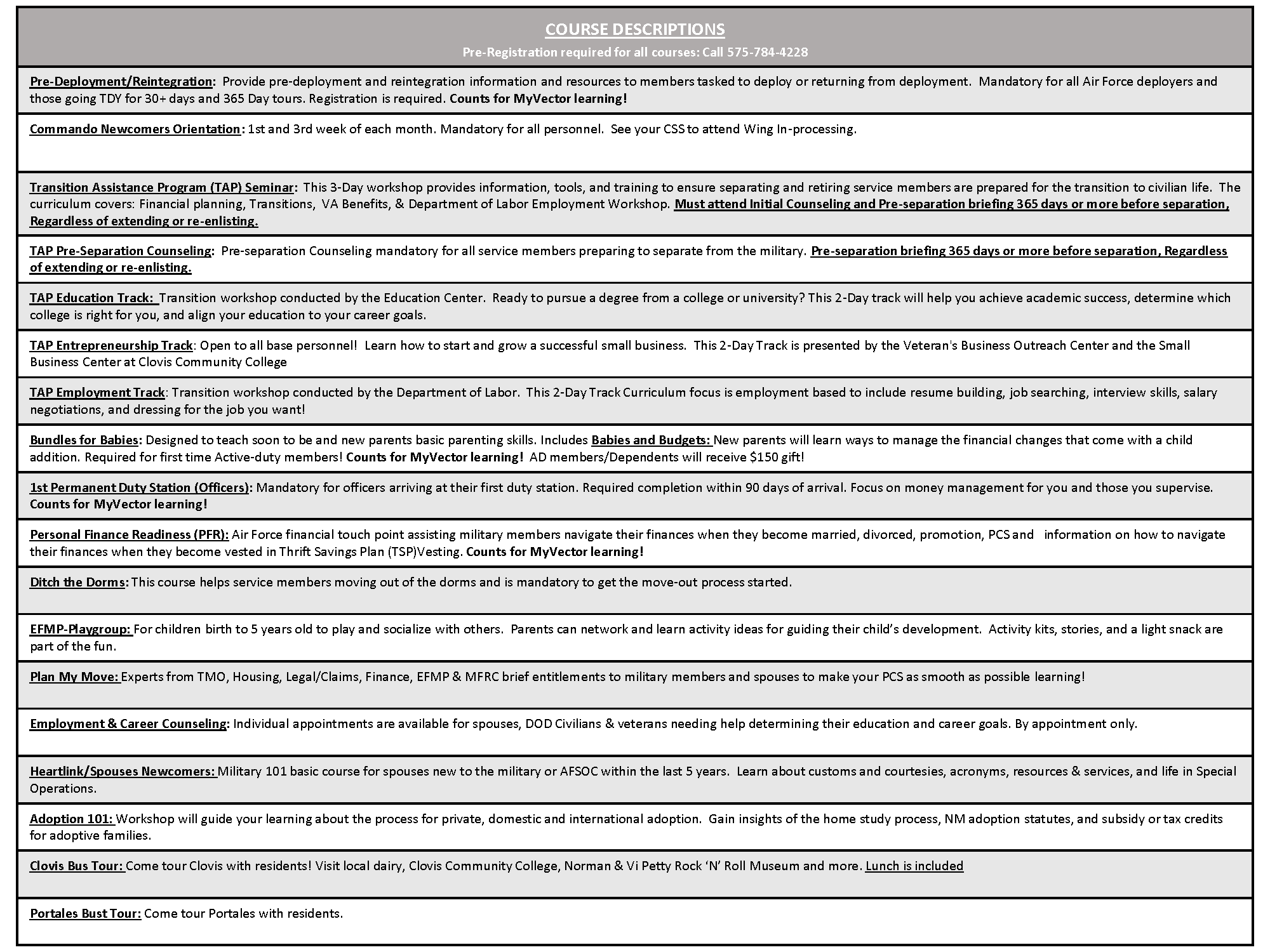 Transition Assistance Program, Personal Financial Readiness, Exceptional Family Member Program Support, Relocation Assistance Program, Air Force Families Forever, Personal Work/Life, Volunteer support, Employment Assistance Program, Military Family Life Counselor (MFLC), Air Force Aid Society Information, Casualty Assistance, Survivor Benefits, Information and Referral.